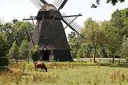 The windmill is built to an octagonal design. The upper part is reed-thatched, and the cap is thatched with straw.