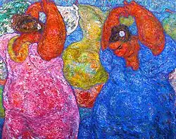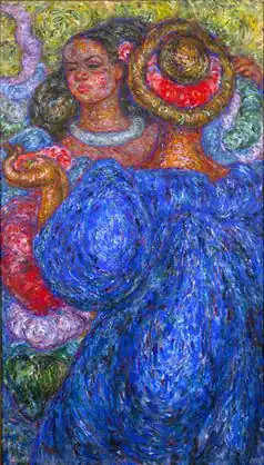 A renowned art educator as well as painter of modern figurative canvases of Hawaiian subjects, Madge Tennent had a distinguished career based primarily in Hawaiʻi from where she sent paintings to the mainland United States for exhibitions in New York City and Chicago between 1930 and 1939. She was among the first artists to embrace native Hawaiians as a primary subject matter, whom she depicted as large and robust with audacious, swirling forms and colors. Two Sisters of Old Hawaiʻi, in the collection of the Hawaii State Art Museum, is an early example of her large paintings of Hawaiian women. Her influence was increased by her association with the Honolulu Museum of Art in its early days, where she was a frequent lecturer, and where she was included in most of the academy's early group shows.