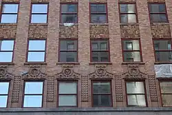 The shaft, consisting of the fourth through fifteenth stories, includes continuous vertical piers made of brick. The piers subdivide the facade into narrow bays, which contain one recessed window on each floor. The windows are surrounded by red metal frames, and the window openings on each floor are separated by spandrels made of multicolored brick. On 34th Street and Madison Avenue, the fourth floor windows are flanked by terracotta panels and topped by terracotta pediments.[6] On 33rd Street, the windows are not decorated or recessed, and there is a band course above the tenth floor. The 33rd Street side is set back above the eleventh floor.[12]