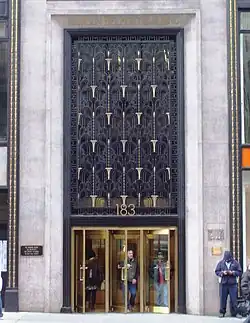 The design was distinguished from Warren and Wetmore's previous commissions, which had included the Grand Central Terminal and surrounding structures. 183 Madison Avenue's design also included more modern influences in the Art Deco style, which had just started to become popular when the building was completed.[6] In addition to brick and architectural terracotta, the building used 60 short tons (54 long tons; 54 t) of iron.[11] Brandt's lower-floor design was one of the first usages of Art Deco in a building in the United States.[12][13] In 1925, International Studio magazine characterized the main entrance doors as being "carried to the nth power of perfection".[5]