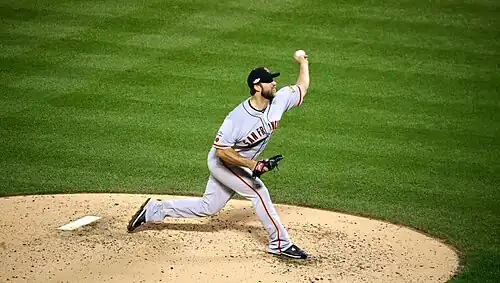 Madison Kyle Bumgarner (born August 1, 1989), nicknamed "MadBum",[1] is an American former professional baseball pitcher. He played in Major League Baseball (MLB) for the San Francisco Giants (2009–19) and Arizona Diamondbacks (2020–23). Bumgarner has won three World Series championships (2010, 2012, 2014) and two Silver Slugger Awards (2014, 2015). He has also been selected to four National League (NL) All-Star teams and has the most strikeouts in franchise history by a Giants left-handed pitcher.[2]
