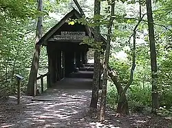 The trail consists of 1.5-mile (2.4 km) loop with additional side trails. It is a good trail for beginners, fairly flat and wide footbed with good signage.[3] 0.5 miles (0.80 km) of the trail is a Braille trail.[4] The trail crosses the Cambron Covered Bridge named after Joe E. Cambron, who was the Madison County Bridge Foreman from 1958-1974. The bridge makes for great photos, especially in black and white[2] A historic log cabin is open to explore. The log cabin was originally built about 1810 somewhere near New Market. It was donated to Madison County by the Herbert P. Walker family, brought to the Nature Trail, and reassembled.[2] Other facilities include an open air pavilion, A-frame chapel, outdoor classroom, picnic area and accessible rest rooms. Fishing is allowed Monday through Friday only, (fee charged).[1]
