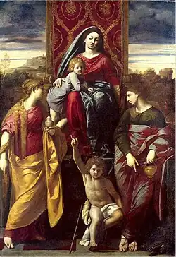 Madonna and Child with Saints, Madonna and Child Enthroned with the Infant St John the Baptist, St John the Evangelist and Saint Catherine of Alexandria or the San Giorgio Madonna is a 1593 oil painting on canvas by the Italian Baroque painter Annibale Carracci, originally in the Landini chapel in the church of San Giorgio in Poggiale, Bologna. During the 19th century the conservation conditions there worsened and it was moved to the Accademia di Belle Arti for restoration, before being moved to its current home in the then-new Pinacoteca Nazionale di Bologna.[1] It is signed and dated "ANNI CARR FE MDXCIII".