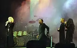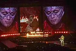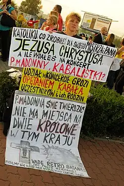 Various Madonna's concerts were condemned by religious adherents, including radical Orthodox believers.[76][111] For instance, during her 1993's Girlie Show, Plinio Corrêa de Oliveira, a Brazilian traditional Catholic activist reported protests and "rebuff" in countries such Germany and Argentina.[112] She angered many Polish religious adherents in various of her stops when she toured.[113] According to Evangelical Times during her Dutch stop of the Confessions Tour, police arrested a 63-year-old priest who admitted to making a hoax call in an attempt to disrupt the event. A bomb threat was also reported.[114] In January 2023, Madonna sparked again outrage among Christian community after doing an all-female Last Supper photoshoot, and also for channeling Virgin Mary as Our Lady of Sorrows, on the first Vanity Fair's European "Icon issue".[115] The European Conservative headlined, that her photoshoots "Reveals Deep Occult Roots of the Entertainment Industry".[116]