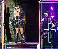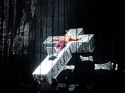 Catholic iconography has been Madonna's constant.[16] She is credited with even popularizing the cross in pop music as a decorative object, which she uses in her shows and videos.[60] Martin commented that her love affair with the cross "has spanned her music career".[57] As her career continued, she involved Kabbalistic motives in her work and reportedly refused to work on Friday night and Saturday, as a result in her observance of the Jewish Sabbath.[23][61] Religious Jewish symbols and Hebrew letters featured in some of her works, and Madonna was seen numerous times, with the red string around her wrist to ward off the evil eye,[62] a trendy practice among celebrities during the Bush era, according to a Vice contributor.[27]