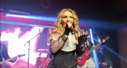 American journalist Ricardo Baca estimated Madonna as the most imitated woman in the world at some stage of her career.[89] In Madonna: An Intimate Biography (2001), J. Randy Taraborrelli has concurred that she is "one of the most emulated female performers in show business history".[90] In 2017, Spanish-language website Algarabía, included her among their list of the "most imitated celebrities in competitions, shows and television programs".[91] Madonna was aware of being often emulated; during the promotion of her 1994 single "Secret", she shared in internet, an audio file where she recorded a part saying: "It's Madonna. Often imitated, but never duplicated".[92] Journalists from media outlets such as Los Angeles Times and Wonderwall have used a same description.[93][94] At the 1999 MTV Video Music Awards, there was a special tribute to Madonna with dozen Madonna-dressed drag queens. Her response was: "All I have to say is that it takes a real man to fill my shoes".[95] A year prior, in 1998, "The Blonde Exhibition" was a dedicated tribute show in Las Vegas by 11 professional impersonators.[96] In "She's Not Me", from her 2008 album Hard Candy, she explored the idea of being emulated by another woman.[97] Finally, the world record as the largest gathering of people dressed as Madonna at the same time in a single event is 440. It occurred on 30 August 2014, by the 2014 Fool's Paradise Drag Party in Fire Island Pines, New York. This feat was listed by both Guinness World Records and World Record Academy.[98][99]