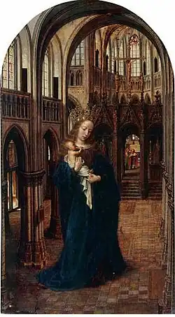 Several art historians have reasoned why van Eyck did not model the interior on any actual building. Most agree that he sought to create an ideal and perfect space for Mary's apparition,[26] and aimed for visual impact rather than physical possibility. Buildings suggested as possible (at least partial) sources include Saint Nicholas' Church, Ghent, the Basilica of St Denis, Dijon Cathedral, Liège Cathedral and Cologne Cathedral,[27] as well as the basilica of Our Lady in Tongeren, which contains a very similar triforium gallery and clerestory.[26] Tongeren is one of a minority of churches in the region aligned on a north-east to south-west axis, so that the lighting conditions in the painting can be seen on summer mornings.[28] In addition, the church contains a standing statue of the Virgin and Child (the Virgin with a tall crown), once credited with miraculous powers, though the current statue post-dates van Eyck.[29]