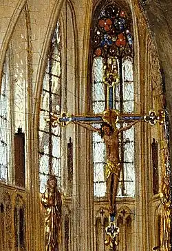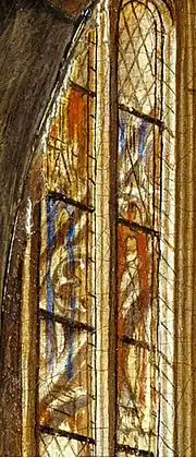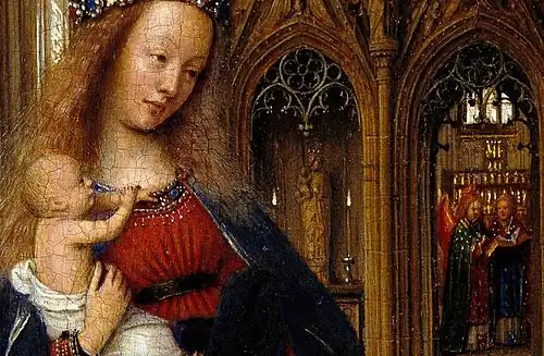 Further depictions of Mary are found in the church background. They include a statue of the Virgin and Child positioned between two lit candles in the choir screen behind the main figures, and to the right two angels stand in the choir singing her praises (perhaps singing the hymn inscribed on the frame). Above her is an annunciation relief, and in the recessed bay a relief depicting her coronation; the crucifixion is shown on the rood. Thus, the stages of Mary's life as mother of Jesus are depicted in the painting.[16] A two-column prayer tablet – similar to the one depicted in Rogier van der Weyden's large Seven Sacraments Altarpiece (1445–1450) – hangs on a pier to the left. It contains words alluding to and echoing the lines on the original frame.[1] The windows of the clerestory overlook flying buttresses, and cobwebs are visible between the arches of the vault.[17] Several different building phases can be seen in the arched gallery, while the choral balcony and transept are depicted in a more contemporary style than the nave.[17]