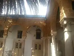 The patio has high arches on stone columns with Turkish capitals on all four sides of an almost square courtyard. The porticos are covered with El Haouaria stones. Each portico has three arches carved from the same stone. A glazed tile cornice surrounds the upper walls of the patio.