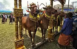 The Sinhala cattle, a Zebu breed from Sri Lanka, were introduced more than 1500 years ago, and the crossbreeds between the two was found to be better in body size than either of the original breeds. Some sources say the Zebu component was Ongole Cattle from India.[3] The coloration is reddish brown with non-specific white patterning on the back and rump. They are a small breed, bulls having a mature weight of 250 to 300 kg,[4] it is used for racing by the locals[5] and are sometimes called the dancing cattle. In 2002 the population was estimated by the FAO at 900,000. Efforts are being made to conserve the breed on Sapudi island.[6]