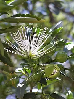 It may reach about 8 metres (26 ft) in height and occurs in dune bush, open woodland or on forest fringes. The leaves are digitately compound with from 3 to 5 leaflets, with entire, ciliate margins and petiolules of only 10 millimetres (0.4 in) or less in length, while the petiole may be up to 60 mm (2.4 in) long. The apex of the median leaflet may be apiculate and vary from broadly acute to rounded. The scented flowers are in terminal clusters with numerous white stamens tinged with green, though petals are absent. The four sepals are greenish in colour and about 17 mm (0.7 in) long, while the stamens are intricately folded in the unopened bud. A single gynophore protrudes from amongst the stamens in the open flower. The fruit is plum-like (oblong-ovoid), up to 50 mm (2.0 in) long, slightly ribbed with longitudinal suture lines clearly visible, and pendent from the long gynophore and peduncle. When ripe it remains green in colour, becoming wrinkled, soft and fragrant, and consumed by many species of bird. The fruit has a thick rind and holds up to 30 flattened, reniform seeds, distributed irregularly in a jelly-like pulp. The grey to dark brown bark, in common with many of this family, is liberally covered in lenticels. Branches and trunks are often markedly flattened rather than round. The wood is brittle and said to have a disagreeable odour when cut. In the past the roots have been ground up for use as a chicory substitute in coffee, and a decoction of roots for curbing menorrhagia and against female infertility.[3][4][5]