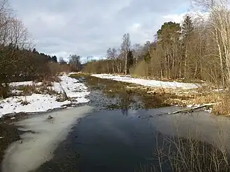 Magelungsdiket had a drainage area of 17 km2 stretching north to Mälarhöjden until the south-western suburbs of Stockholm were built in the early 1950s and water was guided to Lake Mälaren through stormwater pipes. Today only 1,5 km2 remains of the drainage area and most of the contributions comes from one-family houses in eastern Rågsved and green areas around Magelungen. Water flow is slow, often stagnant, and the ditch is surrounded by dense vegetation. It opened out in a wetland drained in 1994 in order to create canals and minor islands attracting birds. Very high levels of metals have been reported from a street inlet near the outlet.[1] Together with Kräpplingadiket, it is estimated to contribute some 100 kg/year of phosphorus. The ditch is one of a few locales for Grass Snake in Stockholm.[2]