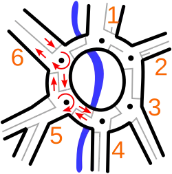 The roundabout is unusual in that traffic flows both clockwise (the standard flow direction of British roundabouts) and anticlockwise. Drivers approaching the roundabout from any junction can choose to turn left or right, and they are free to make U-turns using any of the mini roundabouts at the junction. Effectively, the junction should be treated as six individual roundabouts - right of way must be given on the approach of each new mini roundabout.