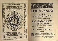 The frontispiece of the first edition is by Claudio Dagli. It depicts the double-headed imperial eagle of the Hapsburg dynasty. It hangs by a magnetised chain from the imperial crown that supports an orb and a cross. Both the crown and the cross are struck through with magnetised arrows pointing towards a heavenly source, but not directly at the all-seeing eye of god directly above - perhaps a reference to magnetic declination.[5]: 23 In one of its claws the eagle holds the crowns of Austria, Hungry and Bohemia, held together by magnetism, while in the other it holds the sceptres of the three realms, similarly linked by magnetic force. Arrows from the bird's outstretched wings project imperial power to the lands below.[18] A lodestone on the eagle's breast carries the dedication to Emperor Ferdinand III and a banner above the eagle's head carries the Latin motto Regna Quis Adiunxit Regnis Nova Sceptra Coronis ("He has added kingdoms to kingdoms and new sceptres to crowns"). A second banner curling around its feet carries the Latin pun Et Boreae Et Austri-Acus (""Needle of the north and south - 'austriacus' also meaning 'Austrian').[5]: 23 In the third edition the dedication to Ferdinand III is replaced on the breast of the eagle by his portrait.[5]: 23
