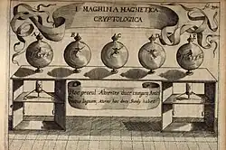 Kircher noted that once objects had been magnetised, they continued to have a relationship with each other even when they were at a distance. He therefore proposed a “machina cryptologica”; this consisted of a number of bottles at some distance from each other, with the letters of the alphabet inscribed around the middle of each bottle. Each also had a lubricated and magnetised stopper bearing a pointer. When the stopper on one bottle is rotated so that the pointer indicates a particular letter of the alphabet, the stopper on the other bottles rotates in the same way. Thus by turning the stopper in one place, someone could send a message to a person observing the bottle at the other end of the machine.[11][1]: 265–6