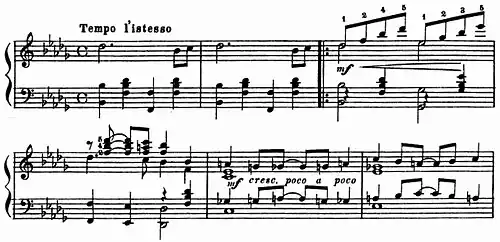 Joplin's usage of Italian tempo indications in "Magnetic Rag" has been interpreted as his intention to give the piece a serious aspect in a similar manner to Treemonisha and "Scott Joplin's New Rag".[6] "Magnetic Rag" begins with the instruction "Allegretto ma non troppo" (moderately fast, but not too much) and continues in the D strain with "Tempo l'istesso" (tempo remains the same), a warning against slowing down for the minor-mode section.[6] Joplin also employed in "Magnetic Rag" the classic "common time" 4/4 time signature instead of the more usual 2/4 time of rag tunes. Simultaneously, Joplin doubled all the note values, effectively making the unusual 4/4 time signature have no practical effect on the way the piece sounded or the way it was performed. His publishing it in 4/4 was simply a way to connect the rag with classical and popular piano works of prior fame.[6] Since Joplin published "Magnetic Rag" himself, it has been suggested that the composition fully reflected his wishes and contained no compromises.[6]