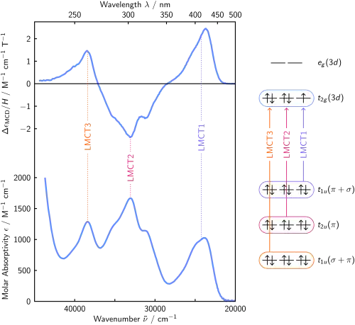 In the visible and near-ultraviolet regions, the hexacyanoferrate(III) ion (Fe(CN)63−) exhibits three strong absorptions at 24500, 32700, and 40500 cm−1, which have been ascribed to ligand to metal charge transfer (LMCT) transitions. They all have lower energy than the lowest-energy intense band for the Fe(II) complex Fe(CN)62− found at 46000 cm−1.[13] The red shift with increasing oxidation state of the metal is characteristic of LMCT bands. Additionally, only A terms, which are temperature independent, should be involved in MCD structure for closed-shell species.