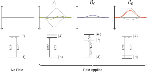The term is due to the field-induced mixing of states. Energetic proximity of a third state to either the ground state or excited state gives appreciable Zeeman coupling in the presence of an applied external field. As the strength of the magnetic field increases, the amount of mixing increases to give growth of an absorption band shape. Like the term, the term is generally temperature independent. Temperature dependence of term intensity can sometimes be observed when is particularly low-lying in energy.
