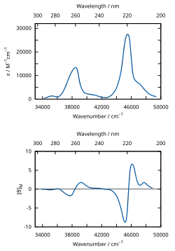 where is the intensity of light at position , is the absorption coefficient of the medium in the direction, and is the speed of light. Circular dichroism (CD) is then defined by the difference between left () and right () circularly polarized light, , following the sign convention of natural optical activity. In the presence of a static, uniform external magnetic field applied parallel to the direction of propagation of light,[2] the Hamiltonian for the absorbing center takes the form for describing the system in the external magnetic field and describing the applied electromagnetic radiation. The absorption coefficient for a transition between two eigenstates of , and , can be described using the electric dipole transition operator as
