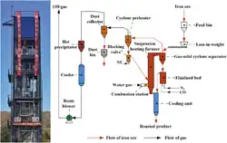 The main steps of suspension magnetization roasting include: Raw material preparation: Mix iron ore powder with reducing agent, add auxiliary agent if necessary to improve roasting effect. Roasting: The mixed material is suspended in the baking furnace by air flow, and at high temperatures (usually between 700 °C and 900 °C), the material is fully in contact with the reducing gas, and the reduction reaction is carried out to convert the iron oxide into magnetic iron minerals. Cooling and collection: The roasted material is cooled by a cooling system and collected by equipment such as a cyclone or a cloth bag collector.[1]