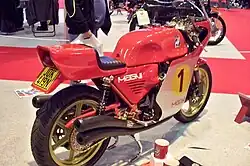 The MH2 was fitted with a box-section swinging arm with eccentric chain adjusters, Tommaselli clop-ons, Forcella Italia forks, Brembo brakes and Magni's in-house EPM cast wheels.[32]