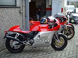 Magni offered a range of parts to upgrade MV fours. They also manufactured complete motorcycles using the parts. The specification varied from customer to customer.[22] Amongst the options were big-bore kits to bring the capacity up to 837 cc (as used on the MV 850 SS Monza),[23] Dell'Orto carburettor kits,[24] exhaust systems, drive chain conversions,[5] the lightweight Magni frame, which was based on Magni's design for the F750 S Imola racer,[5] EPM wheels, 4ls drum brakes and Brembo disc brakes.[25]