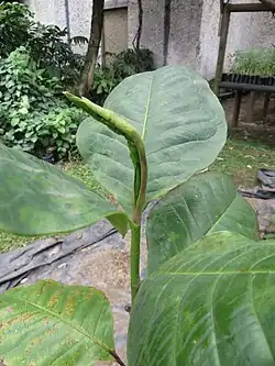 They are trees reaching up to 30 m height and 70 cm in diameter. The heartwood is dark green. Leaves alternate, simple, spirally arranged, obovate, coriaceous, measuring from 14.4 to 25.5 cm long and from 15 to 29.2 cm broad; short and tomentose pubescence on the bottom, much more noticeable in the main vein, and can be felt by touching it; the stipules are large and covered with short and soft pubescence. The flowers are cream color, with a bract on the flower bud covered with a short and deciduous indumentum; they have three sepals and eight thick petals. The fruits are elliptical and asymmetric, measuring from 4.2 to 6.7 cm large and from 3.2 to 3.6 cm broad; the central axis of the fruit has a length of 4.5 to 5.3 cm and 1.4 to 1.7 cm wide; opens irregularly due to the detachment of its carpels. Each carpel has 1 to 2 seeds and in total may contain about 27 seeds; many of them are not fully developed. The seeds have a fleshy scarlet red aromatic cover, with characteristic odor.[2][3][4]