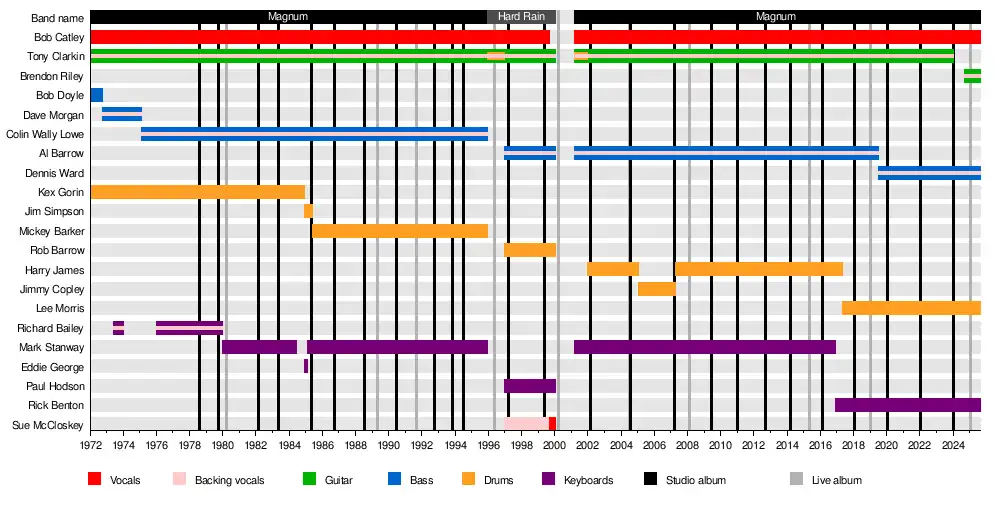 Magnum are an English melodic hard rock band. They were formed in Birmingham in 1972 by Tony Clarkin (guitar, songwriter, producer) and Bob Catley (vocals) in order to appear as the resident band at the Rum Runner nightclub in the city. Magnum have undergone several changes in personnel over the years; however, the core of Catley and Clarkin remained until Clarkin's death in 2024.