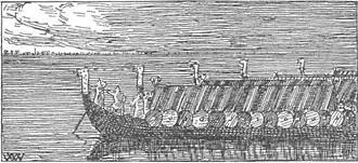 In 1058, Magnus headed an expedition into the Irish Sea that sought to extend Norwegian authority in the region, the Norwegians siding with a faction that opposed the Norse-Gaelic king Echmarcach mac Ragnaill.[5] The expedition also appears to have supported a branch of the Norse-Gaelic dynasty of Ivar that opposed Irish king Diarmait mac Maíl na mBó.[4] Magnus commanded a fleet that, in addition to Norway, recruited men from Orkney, the Hebrides, and Dublin.[6] His forces were later active in Wales[7] and perhaps in England, and English chronicler John of Worcester associates the Norwegian fleet (along with the Welsh ruler Gruffydd ap Llywelyn), with returning the exiled Ælfgar, Earl of Mercia to power.[8] The Irish Annals of Tigernach goes further in claiming that Magnus's goal was to seize power in England, but this is not supported by Welsh and English sources[9] which also includes the Annales Cambriae and the Anglo-Saxon Chronicle.[10]