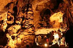 The total length of the 15 million year old cave is 2.5 km (1.6 mi).[3] The average annual temperature of the cave is 12 °C (285 K; 54 °F), except for one room where the temperature is always 15 °C (288 K; 59 °F). The air humidity reaches 80% and the displacement - 56 m (184 ft). The Magura cave was formed in the limestone Rabisha Hill (461 m (1,512 ft) above sea level). The morphology of the cave consists of one main gallery with six various-sized halls and three lateral galleries around it.[4] The main gallery is composed of six chambers, variously sized; the largest one, the so-called Arc Hall, is 128 m (420 ft) long, 58 m (190 ft) wide and 21 m (69 ft) high, including impressive natural vaults, speleothems, spectacular stalactites and stalagmites, named The Poplar, The Pipe Organ, The Oriental City and The Cactus. The very spacious site also allows for music concerts to be held during Christmas and Easter.