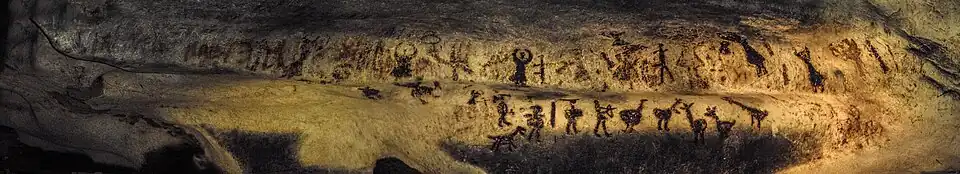 Painted signs can be organised into four thematic groups: anthropomorphic, zoomorphic, geometric, and symbolic (astronomic?) figures.[7] For the first group, there are bitriangular silhouettes with raised rounded arms (females with a sort of a waist bow, males with legs and sex like a trident, sometimes stylised like a "bottle opener"), archers, ithyphallic figures, copula, linear schematic anthropomorphic figures with raised arms (sometimes like dancing) and "fungiforms". Regarding zoomorphic items, there are caprids, bovids, dogs, "ostrich-like" animals (big birds) and schematic linear quadrupeds. Geometric signs show T-shaped figures, vertical parallel lines, horizontal zigzags, vertical parallel zigzags, branch-like or tree-like figures, chessboard patterns, rhombi, horizontal stair-like patterns, crossed networks, honeycomb networks and crossed circles. Few rayed circle figures, mainly the two unica of the so-called calendar scene, likely represent a sun depiction.[8]