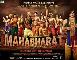 Mahabharat is a 2013 Indian Hindi-language animated film, directed by Amaan Khan and based on the Hindu epic Mahabharata by Veda Vyasa.[3][4] The film is produced by Kushal Kantilal Gada and Dhaval Jayantilal Gada.[5] The film was a Christmas release on 27 December 2013.[6] Several actors like Amitabh Bachchan, Sunny Deol, Ajay Devgn, Anil Kapoor, Shatrughan Sinha, Manoj Bajpayee, Jackie Shroff, Vidya Balan, Anupam Kher, Deepti Naval, and Vrajesh Hirjee were signed up for the characters in the film.[7][8][9][10][11][12] It is touted as the most expensive animated film in Bollywood.[13][14][15].