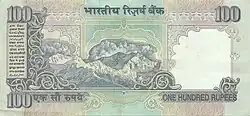 ₹100 | 157 × 73 mm | Blue and green at centre, brown and purple at two sides | Kangchenjunga | 1996 / 2017 | Current | |||