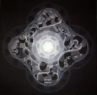 The inspiration for Mahirwan Mamtani's conception of "Centrovision" is derived from the manifestation of tantric doctrines. Emanating from the centre toward the outside, his forms are akin to the mandala concept, the visual manifestation of which are based on the axiom of microcosm versus macrocosm. The feeling of procreation is evoked by the rhythmical arrangement of symmetrical, curvilinear organic forms, the roots of which could be traced in the form of the female, the symbol of Shakti, the supreme cosmic energy. Instead of having a flux of light, the paintings are permeated with the whispering tonal values achieved through the integration of colour hues with soft light which becomes the essential ingredient for the modulation of pulsating circular forms.