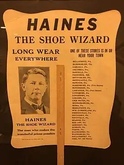 Arriving in York, Pennsylvania in 1905 – the year he turned 30[5] – Haines' bicycle broke down. He reportedly sold his engagement ring, bought ten pairs of shoes, and sold them at a farmers market.[4] Haines initially rented a 3rd-floor apartment at 473 W. Market Street.[6] After borrowing money to begin a business, he was bankrupt within two years. He then obtained a consignment of shoes for $127 from the local D.S. Peterman & Co. warehouse. With a combination of hard work and gimmickry, Haines became very successful in the shoe business.[5] A particular gimmick for which he was known was his use of a customized Ford as a mobile retail store, which he would drive to the outer edges of town to show his products.[2][7] In 1922 he had accumulated 30 stores.[5] By 1931, Haines had the largest shoe store chain in the United States,[7] and there were 50 Haines Shoe Co. stores across Pennsylvania and northern Maryland by 1935.[2][5]