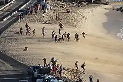 The beach itself is white sand and has little to no vegetation because of jet blast erosion.[1] The Caravanserai Resort, the Sunset Bar and other restaurants/night clubs such as Bamboo Bernies and Bliss are located nearby. The beach is popular with windsurfers and skimboarders because of occasional large waves.