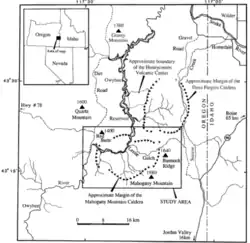 Mahogany Mountain is an ancient caldera volcano on the border of Oregon and Idaho, in Malheur County and Owyhee County, respectively. While its early history is largely unknown, its last eruption was probably 15.5 million years ago. This eruption ejected layers of rhyolite and produced tuff, creating formations of rock in the Leslie Gulch.