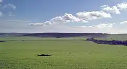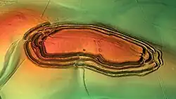 Constructed on a territorial boundary in about 600 BC, the first hill fort at Maiden Castle was a 6.4 ha (16-acre) area surrounded by a single ditch.[20] The hill it sits on is part of a ridge on the north side of the South Winterborne valley, which feeds the River Frome. At the eastern end of the ridge and rising 132 m (433 ft) above sea level, the site of the first hill fort was not the highest point along the ridge. The highest point is the neighbouring Hog Hill, which is only 1 m (3.3 ft) higher.[21] The hill projects about 40 m (131 ft) above the surrounding countryside, which is about 90 m (295 ft) above sea level.[22] The defences were 8.4 m (28 ft) high and consisted of the V-shaped ditch and a rampart.[20] The rampart would probably have been timber-faced around just the entrances. Elaborate timber facing would have been used to impress visitors.[23] The site could be accessed by an entrance in the northwest and a double entrance in the east. The double entrance is unique in hill forts in the British Isles. The reason for a double entrance is unclear; however, archaeologist Niall Sharples has suggested that it was a form of segregation. It is likely that several farming communities lived in the hill fort and wanted different entrances.[20]