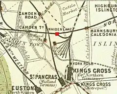 This Maiden Lane station – 51°32′27″N 0°07′37″W / 51.540917°N 0.127051°W –- was a short distance northwest of the Great Northern Railway station and near the present High Speed 1 tunnel portal. It also served King's Cross Goods Yard. It closed in 1916 [2] or 1917,[3] after the LNWR in 1916 electrified the southern pair of the four tracks for passenger services, leaving the northern pair, on which the station was built, solely for steam-hauled goods traffic.