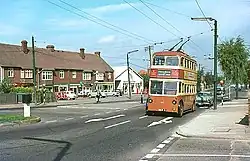 Maidstone Corporation Tramways began operation on 14 July 1904 with the introduction of a service to Barming, supplemented by routes to Loose and Tovil by 1907.[2] The Barming trams were replaced by trolleybuses in 1928,[2] and the Loose trams replaced in 1930.[2] The Tovil tram was replaced by buses in 1929.[3] The Maidstone trolleybus system was expanded with development of new housing until 1963, when the decision was made to convert to buses. The last trolleybuses ran on 15 April 1967.[3]