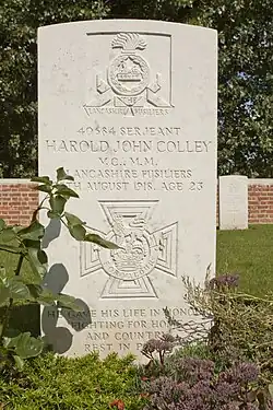- One Victoria Cross recipient is buried in the cemetery: he is Harold John Colley who was killed in 1918. He was also awarded the Military Medal.[3]