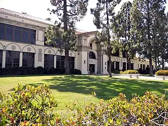 The Main Building, built in 1917, was the first building on the campus, then known as the Torrance School and serving all grades.[2] It is a two-story structure designed in the Mediterranean Revival style, and has architectural elements in the Classical Revival and Spanish Colonial Revival styles.[2] The central two-story section is flanked by one-story wings, which all frame an outdoor courtyard patio.[2]