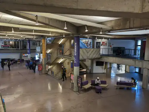 Student life centers around the Cesar Chavez Student Center, known for its distinctive murals and architecture. The building houses the SF State Bookstore, restaurants, lounges, a multicultural center, pub, student art gallery, and ATMs. It serves as home to the Associated Students organization and includes an Information Desk near the Quad entrance.[14]