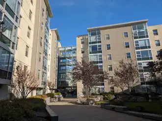 Student housing options are varied, with several residential communities. The Village at Centennial Square offers apartment-style living with dining options and a convenience store. Mary Park Hall, Mary Ward Hall, and West Grove Commons provide traditional residence hall communities for freshmen, while the Towers at Centennial Square offers more independent suite-style housing.[15][16][17] Additional housing exists in University Park North and South, which provide apartment living for transfer students, returning residents, and students with families.[18][19] Manzanita Square provides residential apartments with outdoor courtyards, retail spaces, student support facilities, and laundry services.[20]