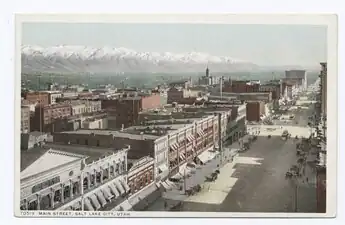 Main Street is the most important commercial street in Salt Lake City, Utah, United States though it also extends south into the cities of South Salt Lake, Millcreek, and Murray. Its commercial importance is almost totally derived from the few blocks of the street which are immediately south of Temple Square that have attracted banks, major retailers, and heavy foot traffic throughout Salt Lake City's history; the long southern extension of Main Street south of about 500 and 600 South, in contrast, is always in the shadow of State Street (one block to the east), which (due to width, speed limit, and restraint of cross traffic) is more designed for the long-distance automobile traffic that is common away from downtown.