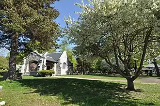 The oldest portion of the cemetery appears to be its northeastern section, which is where the town's first meeting house was located. The cemetery's oldest dated burials are from 1788, not long after the town's incorporation (1784). The two largest plots in the cemetery are those of the Crane and Weston families, both of which have been historically important to the town's papermaking business. The cemetery chapel, built in 1907, is a prominent local example of Gothic Revival architecture, designed by the Pittsfield firm of Harding & Seaver.[2]