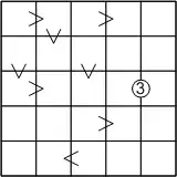 Mainarizumu is played on a square grid, typically 7x7 or smaller, with two kinds of clues: a greater-than or less-than sign connecting two adjacent squares, or a circled digit connecting two adjacent squares. The solver is to enter a digit into every square so that: