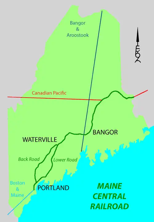 Maine Central operated parallel main lines between Royal Junction and Waterville. The northerly inland main line was known as the back road, and the slightly shorter main line up the Kennebec River was the lower road. Maine Central mileposts east of Waterville computed mileage via the lower road.[3] The line between Royal Junction and Danville Junction was built to provide a wholly owned route to Portland in place of the Grand Trunk Railway connection from Danville Junction originally used by the former Androscoggin and Kennebec Railroad. This was the only portion of the Maine Central main line built by the Maine Central rather than predecessor companies.