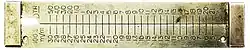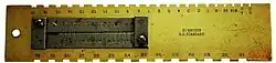 About 1840 Aaron Lufkin Dennison devised a gauge "upon which all the different parts of a watch could be accurately measured", Figure 3. Later this became known as the "US Standard" gauge. The edges have the usual notches for mainspring heights (based on the Imperial inch, but there is no obvious way to determine mainspring strength, except perhaps by barrel diameter using one of the three scales on the top left (which are Imperial inch scales in 1/64 and 1/32 divisions).