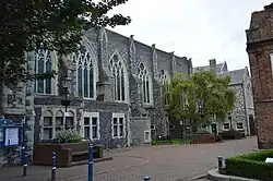 At the opposite end of the new hall, to the north-east, a new 'Mayoral Suite' was constructed; this extended the building's elevation (in a more 'domestic' style) along Ladywell. It contained the Mayor's Parlour (with its large oriel window) and other offices and function rooms.[1] All the principal rooms were on the first floor; the ground floor contained offices, accommodation for a caretaker and service areas. As part of the redevelopment a police station was created at this level, underneath the Stone Hall (accessed by a separate entrance from the High Street); accommodation was provided for the Superintendent in the adjacent medieval tower.[6]